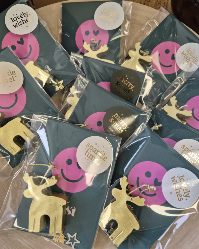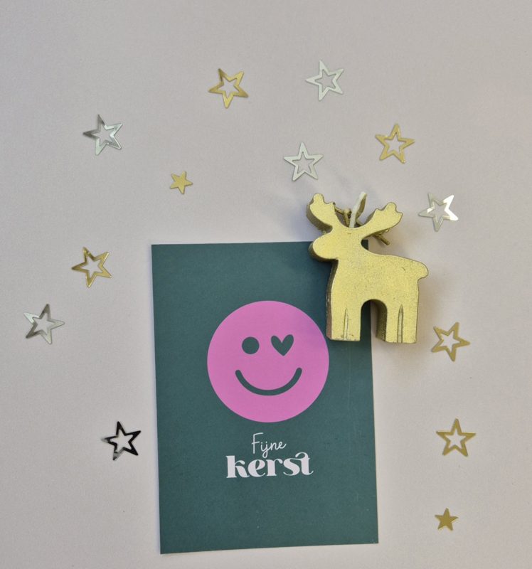 Breng een vrolijke en feestelijke sfeer in huis met deze stijlvolle kerstkaart! De kaart heeft een leuke roze smiley met knipoog (miekinvorm), gecombineerd met een gouden rendier (kaarsje) en glinsterende sterren, waardoor het een echte eyecatcher is tijdens de feestdagen.