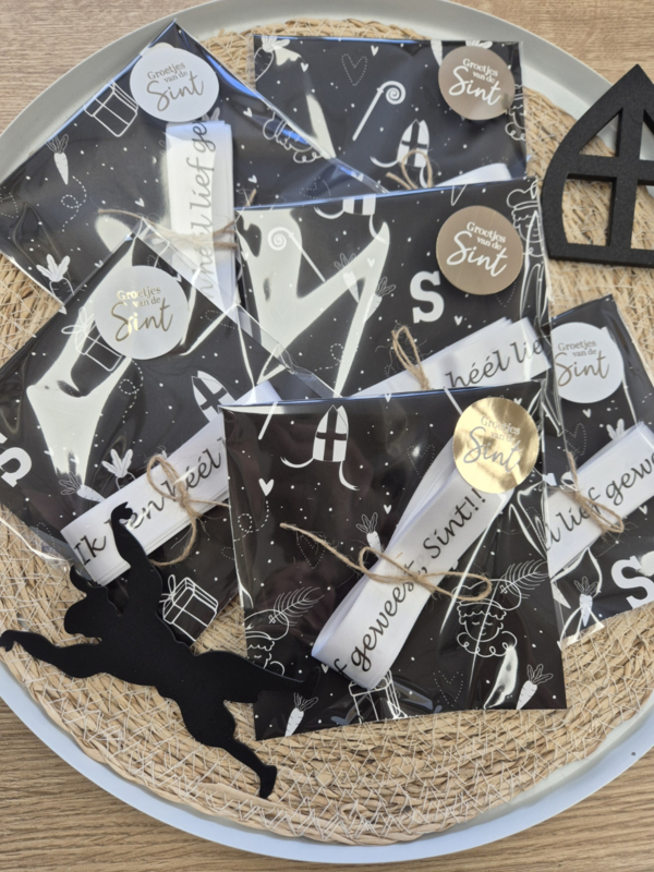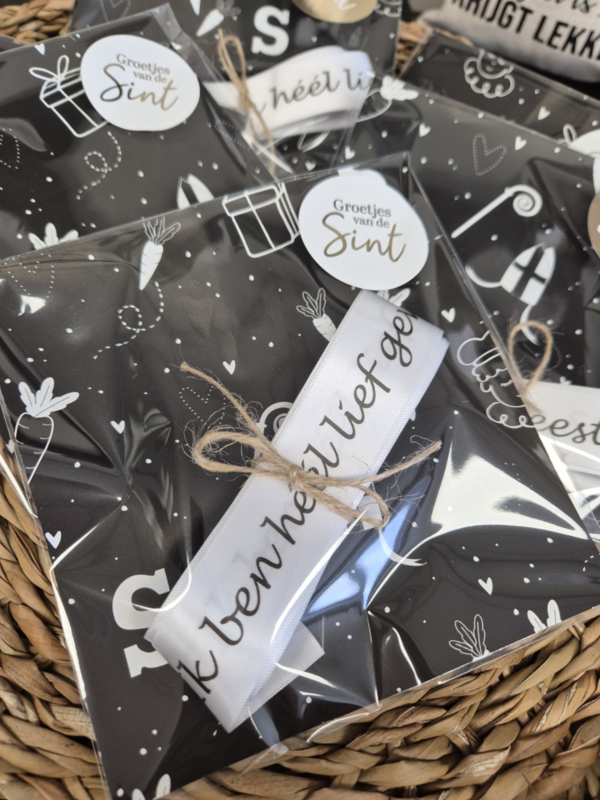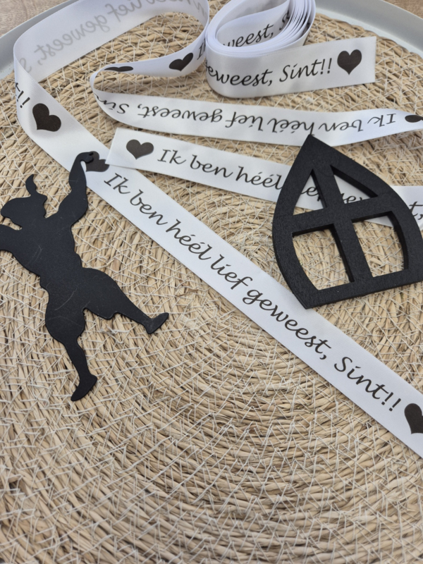 Satijnen lint met de tekst “Ik ben héél lief geweest, Sint!!”