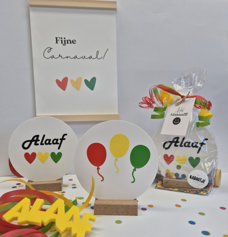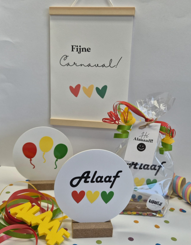 De ronde wenscirkel heeft een doorsnede van 14 cm en staat stevig op een mdf voetje, waardoor hij perfect is om neer te zetten op een tafel, bar of vensterbank. De frisse carnavalskleuren, het speelse Alaaf design en de feestelijke uitstraling maken dit item ideaal als decoratie tijdens carnaval.