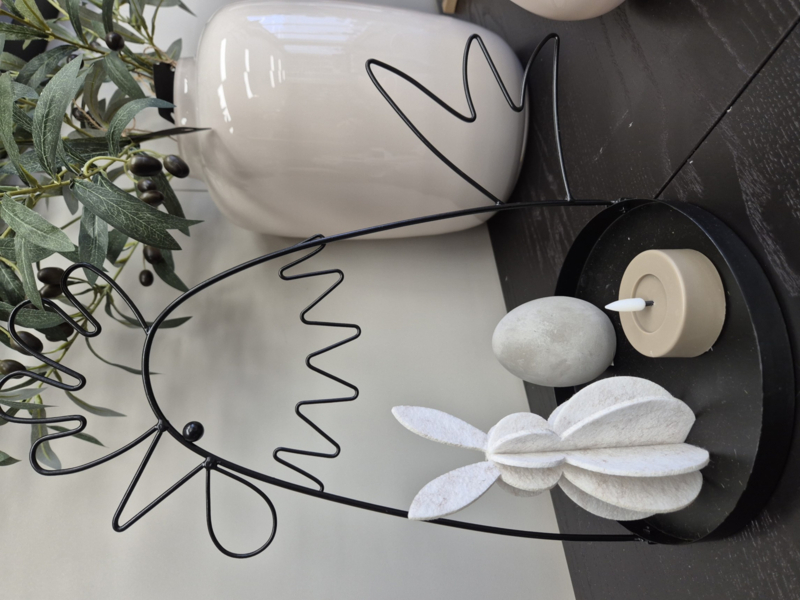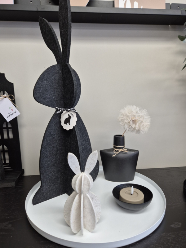 Dit vilten konijn is een sfeervolle decoratie die perfect past bij het lente en voorjaarsgevoel. Dankzij het zachte materiaal en het minimalistische ontwerp straalt het konijn rust en warmte uit ideaal voor een stijlvol interieur.